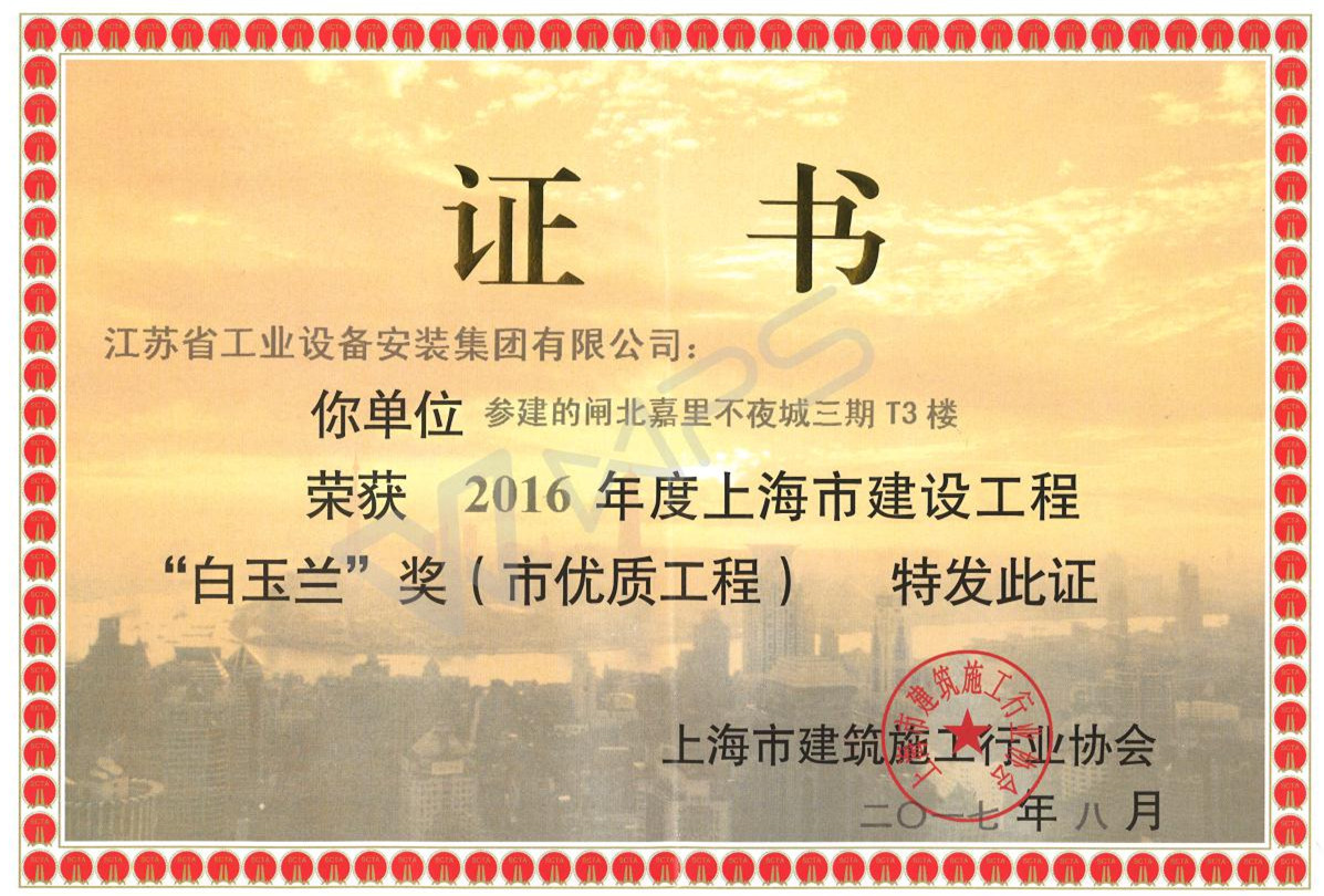 2016年12月,江蘇省工業設備安裝集團有限公司通旺分公司參建的上海閘北嘉里不夜城三期T3樓項目成功入選上海市建設工程“白玉蘭”獎(市優質工程),該工程經過一冬一夏的使用考驗,無質量問題,2017年8月正式頒獎予以表彰。